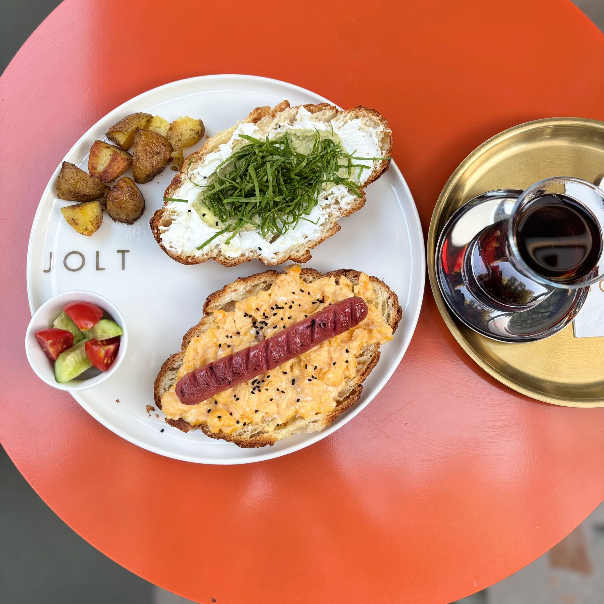 Çırpılmış yumurta, dana frankfurter sosis, labne, roka, avokado dip sos, baby patates, salatalık ve domates eşliğinde